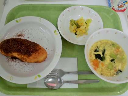 献立 ココア揚げパン、洋風卵スープ、キャロットソースサラダ、牛乳
