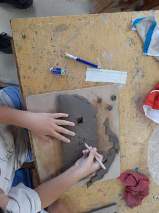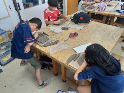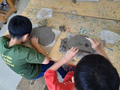 図工の時間です。粘土でランプを作っています。形や模様をよく考えて作っています。できあがりがとても楽しみです。
