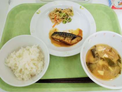ご飯、さばのピリ辛ソースかけ、野菜のごま和え、えのきのみそ汁、牛乳