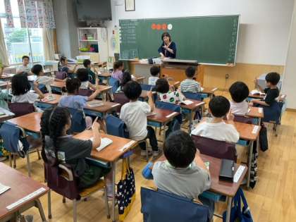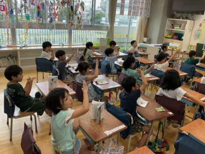 音楽の時間です。「世界中のこどもたちが」を手話をしながら歌っています。