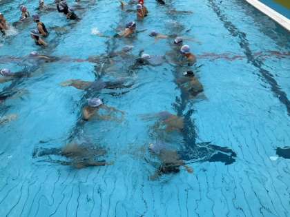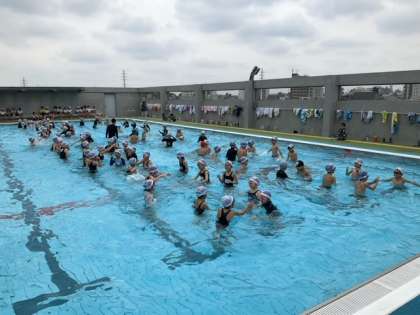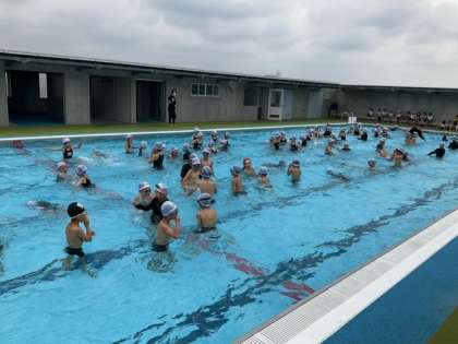 体育の時間です。バディをしっかり意識して活動しています。水中じゃんけんで水慣れをしています。