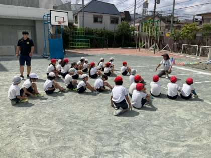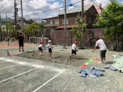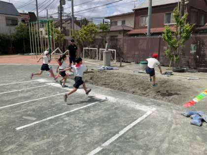 体育の時間です。走り幅跳びに取り組んでいます。跳んだ距離で点数を競います。