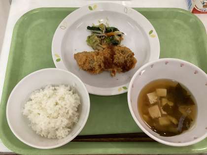 献立 ご飯、お魚のフライ、小松菜のおかか和え、豆腐のみそ汁、牛乳