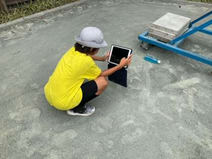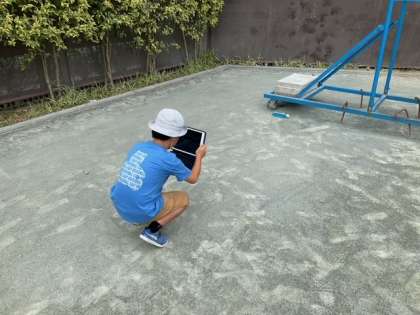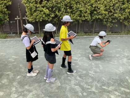 理科の時間です。「どうして校庭に水たまりができるのか」という問題意識から、実際にフィールドワークを通して確認しています。