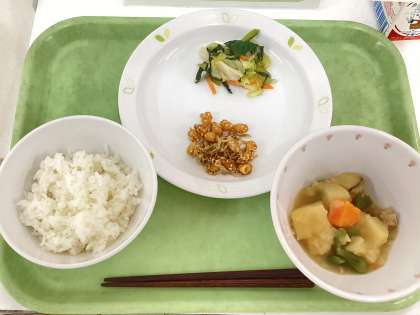 献立 ご飯、塩肉じゃが、大豆とじゃこの甘辛揚げ、小松菜サラダ、牛乳