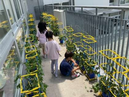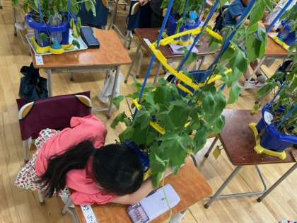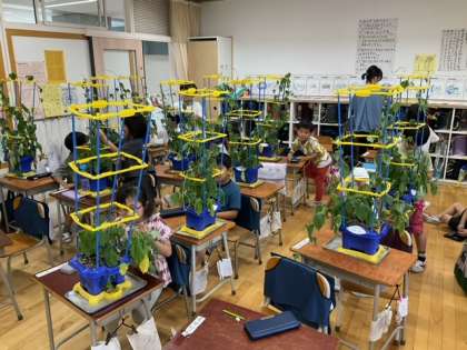 生活科の時間です。「さかせたいな わたしのはな」あさがおの花やつぼみを観察します。