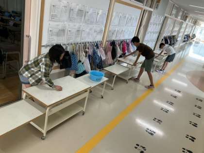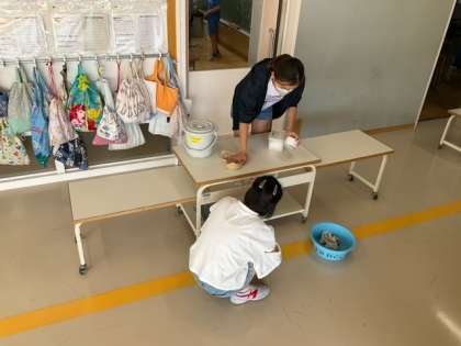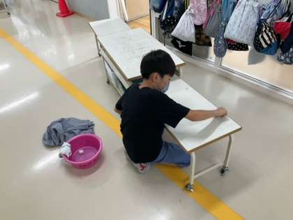 給食委員のみなさんの活動の様子です。配膳台をピカピカに磨いてくれています。ありがとう。