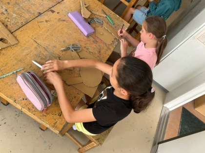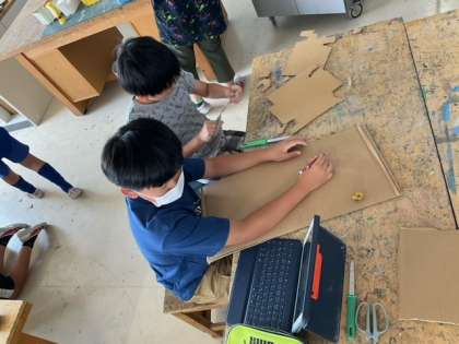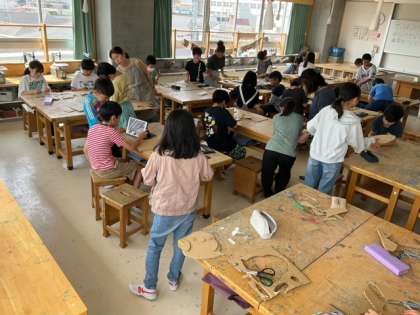 図工の時間です。「でこぼこの絵」ダンボールを自由に切って、魅力的なでこぼこ画面を作っています。