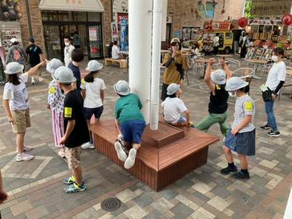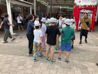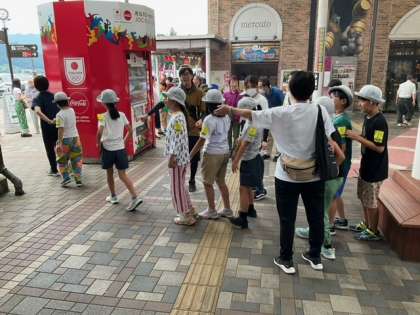 談合坂サービスエリアに到着しました。バスの中では、自己紹介をしたり、クイズをしたりして過ごしています。