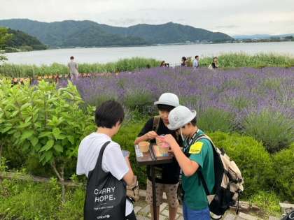 名物のソフトクリームを堪能しました。ラベンダーが一面に広がっています。