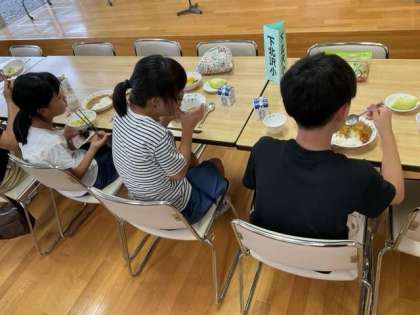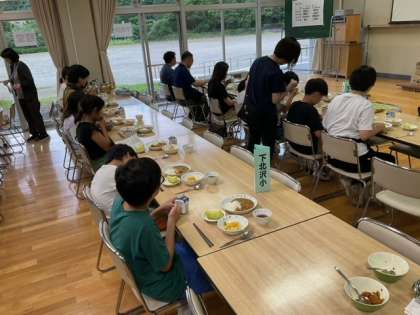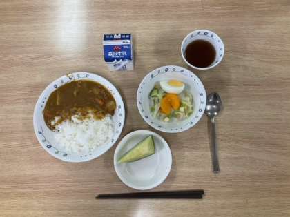 1日目の夕食の時間になりました。カレーライス、サラダ、メロンです。