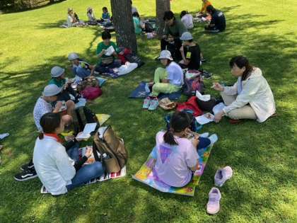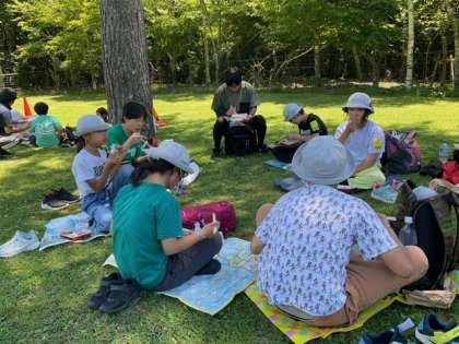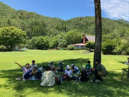 ハイキングのあとのお弁当タイムです。緑に囲まれて、お腹も空いて、美味しいですね。