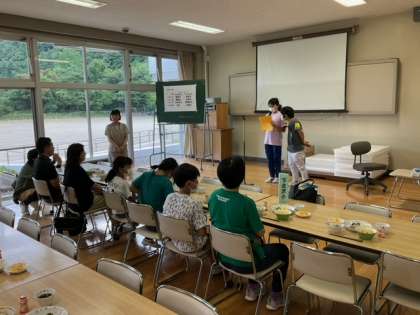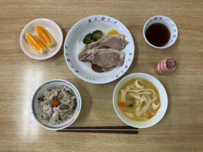 2日目の夕食の時間です。炊き込みご飯、ほうとう、豚ロースのソテー、オレンジ、ヤクルトです。