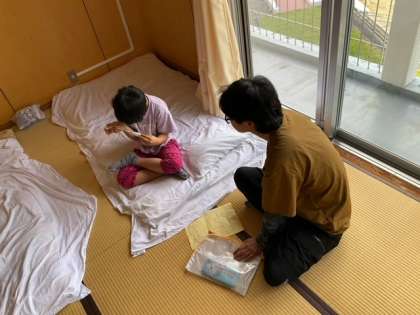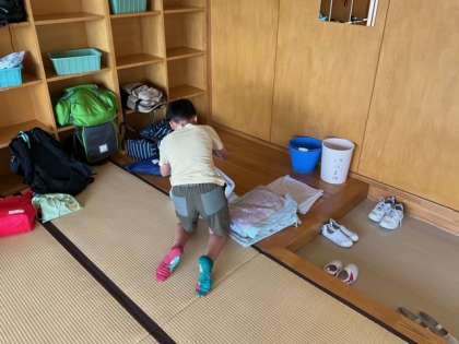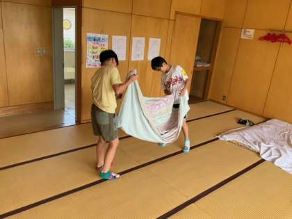 起床の時刻になりました。6年生がリードして、着々と部屋の片付けが進んでいます。