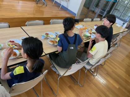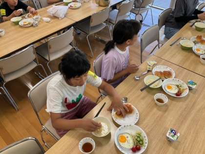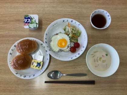 3日目の朝食です。パン、ベーコンエッグ、サラダ、コーンスープ、ヨーグルトです。