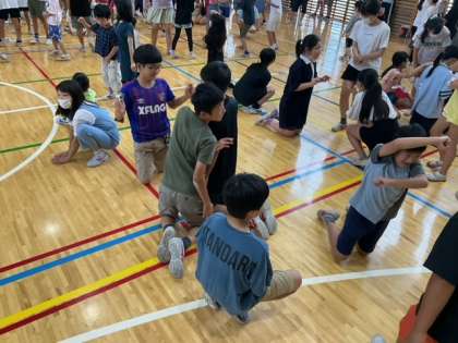 今朝の児童集会は、「進化ジャンケン」です。ジャンケンで勝つと、どんどん進化して、最後は人間になります。大盛り上がりです。