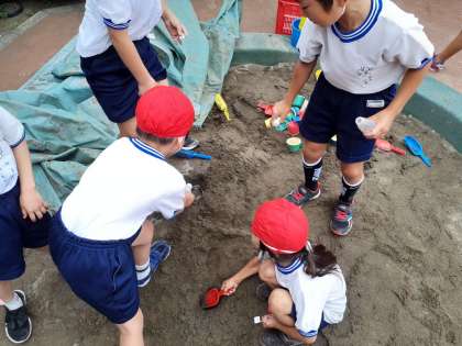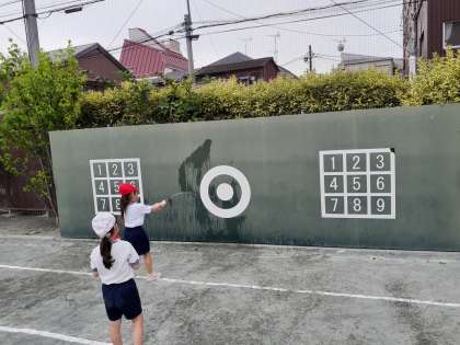 生活科の時間です。マヨネーズの容器を使って、たくさんの遊びを考えて遊びました。暑い夏も楽しそうです。