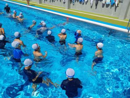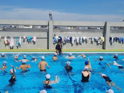 体育の時間です。水泳の授業では、クロールのてのかき方や息継ぎの仕方を練習しました。