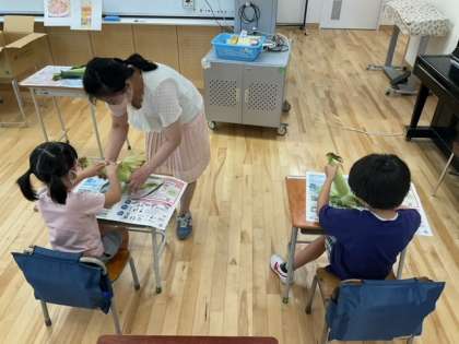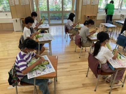生活単元の時間です。「とうもろこしと なかよくなろう」今日の給食に、みなさんがむいてくれたとうもろこしがでますね。