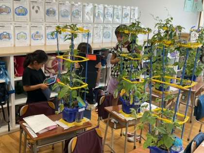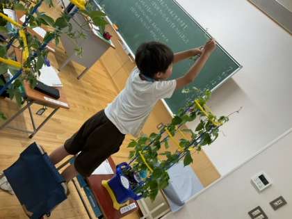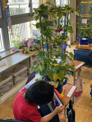 生活科の時間です。あさがおの観察をしています。咲いた花をiPadで撮影して、じっくりと観察します。