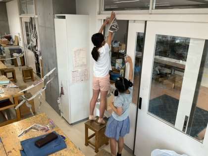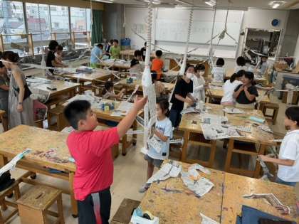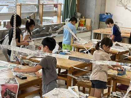 図工の時間です。なが〜く切った新聞紙で、図工室を大変身させています。楽しそうだなー