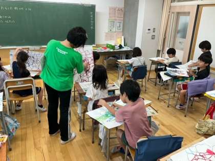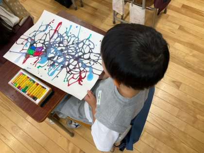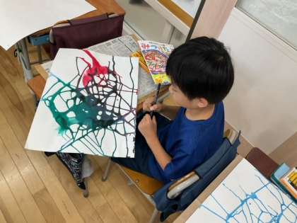 図工の時間です。「えのぐをたらした形から」どんな形があらわれてくるのでしょうか?