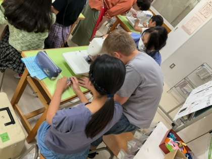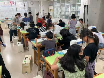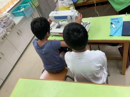 家庭科の時間です。今日は、3組が「ミシンにトライ」しています。上糸と下糸をセットして、下糸を出すまで、さあ何秒!