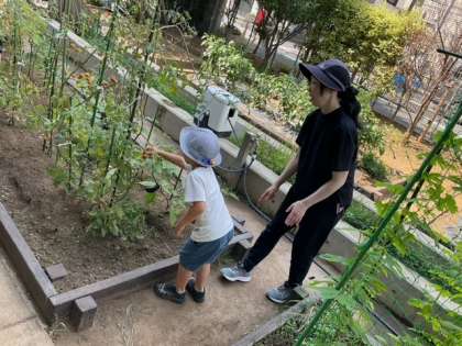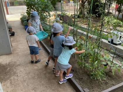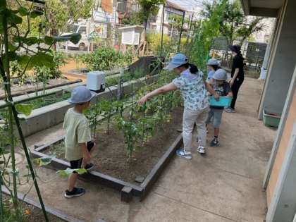 グループ学習の時間です。ミニトマトの収穫をしています。たくさんとれてよかったですね。