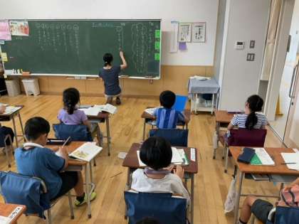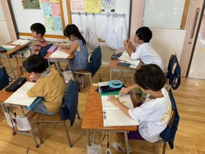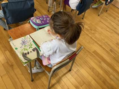 国語の時間です。「おむすびころりん」を読んで、面白かったことや不思議だなと思ったことなどを書いています。