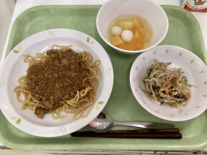 献立 ジャージャー麺、もやしのごま酢和え、白玉フルーツポンチ、牛乳