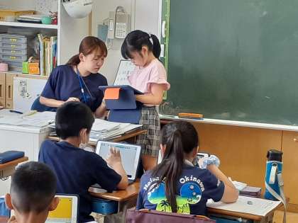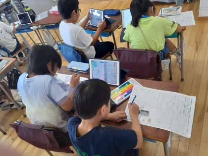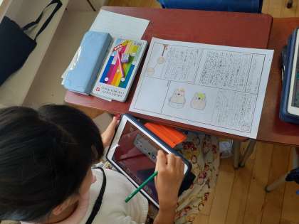 総合の時間です。下北沢○○博士になろうの新聞を友だち同士で見合い、よいところを見付けました。