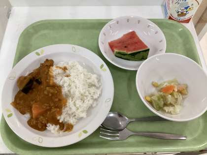 献立 夏野菜カレーライス、コーンサラダ、小玉すいか、牛乳