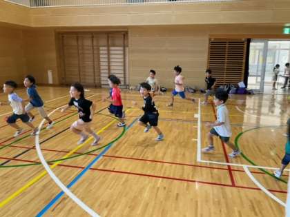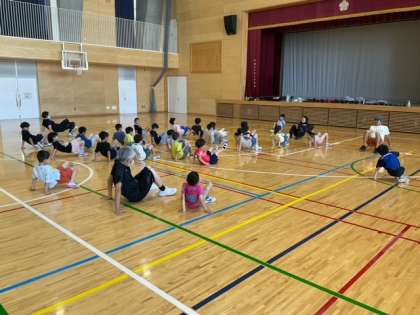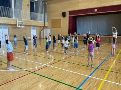 世田谷区スポーツ推進委員のみなさんによる「スポーツチャンバラ教室」です。しっかり準備運動をしています。