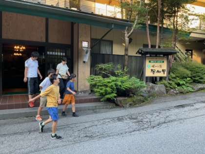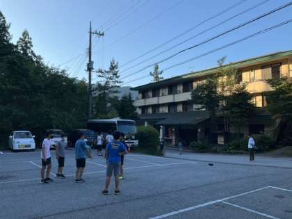 さわやかな朝、子どもたちが朝会に集まってきました。もっと寝ていたかったね。