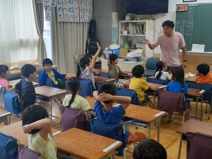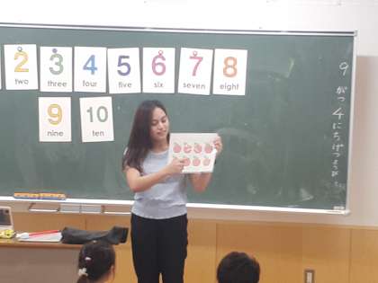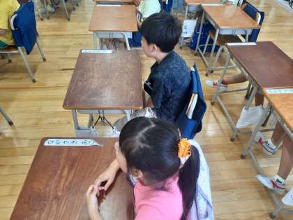 外国語の時間です。英語で数を数えました。質問の答えが分かったときに「I know」と手を挙げています。