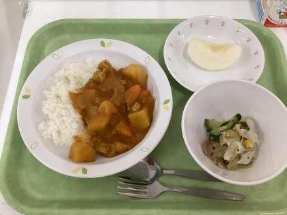 献立 チキンカレーライス、ツナサラダ、梨、牛乳