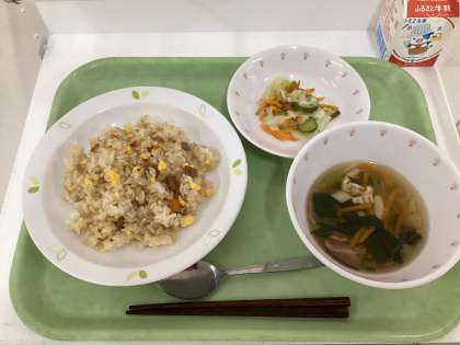献立 チャーハン、かぼちゃチップスサラダ、春雨スープ、牛乳