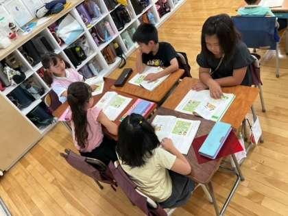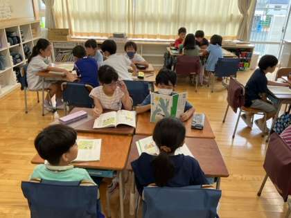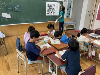 国語の時間です。「たいわのれんしゅう」言葉で道案内をしています。相手にしっかり伝わるかな?