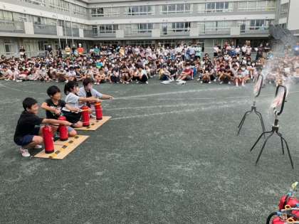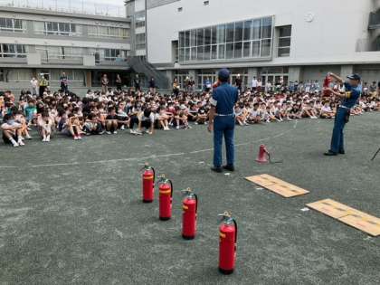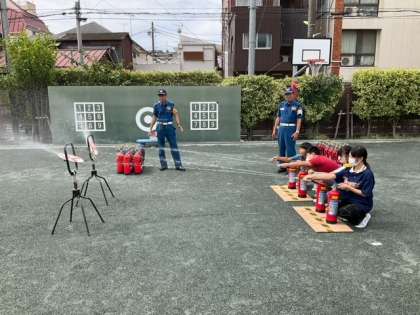 火災を想定した避難訓練を行いました。その後、6年生が代表して、消火器を使った初期消火訓練を体験しました。