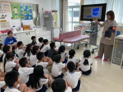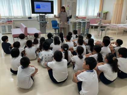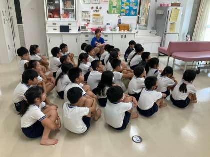 保健指導の時間です。「自分の体も、相手の体も大切にしよう」というテーマで学習しています。