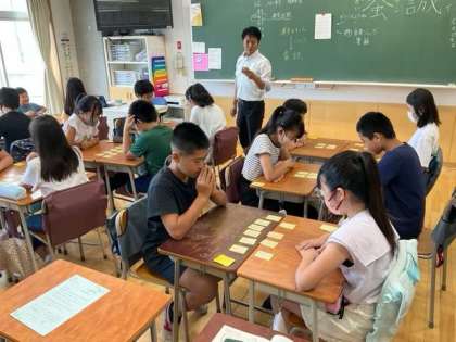 日本語の時間です。百人一首に取り組んでいます。なかなか早いですね。