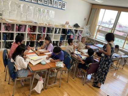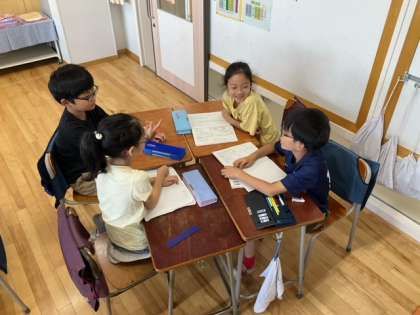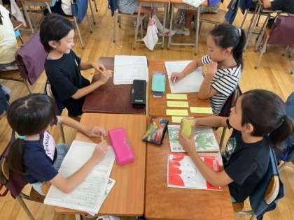 国語の時間です。「山小屋で三日間すごすなら」をテーマに、対話の学習に取り組んでいます。