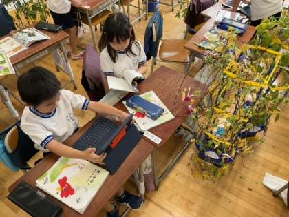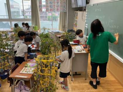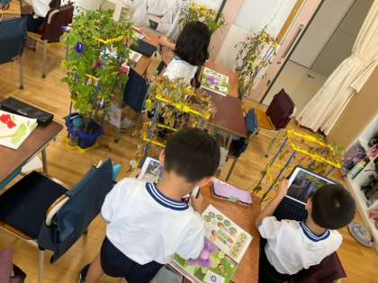 生活科の時間です。朝顔の観察をしています。全体の様子と種ができているところを一枚ずつ選んで、iPadで写真に撮っています。