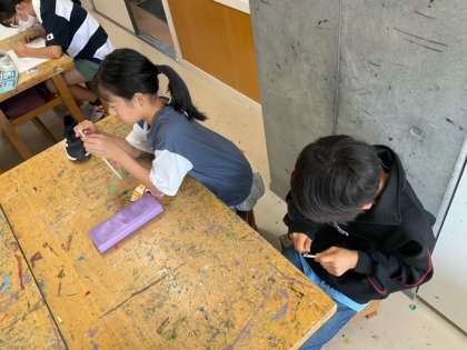 図工の時間です。「運動ぐつに ありがとう」自分でわりばしペンを作り、墨を使って運動靴のデッサンをします。