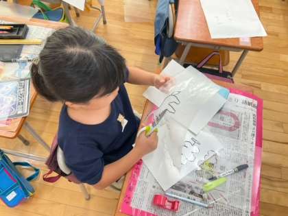 図工の時間です。思い思いに型紙を作って、カラフルな版画に挑戦しています。