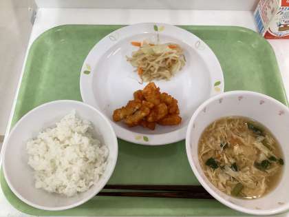 献立 ご飯、いかのチリソース、野菜の甘酢和え、かきたま汁、牛乳