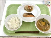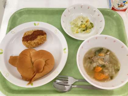 献立 黒砂糖パン、かぼちゃコロッケ、コーン入りフレンチサラダ、野菜スープ、牛乳
