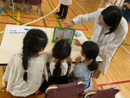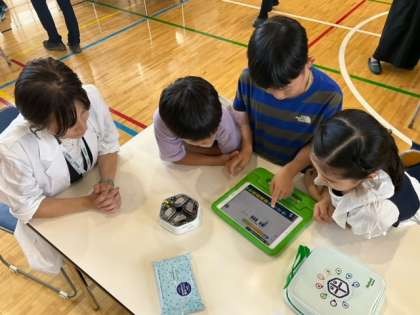 ミッションカードが配られて、協力しながらプログラミングに挑戦しています。「やった〜、できた!」