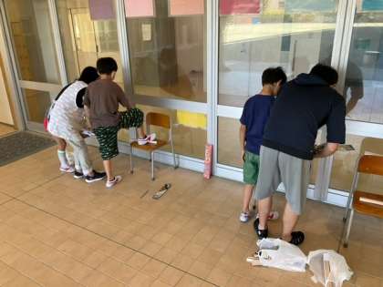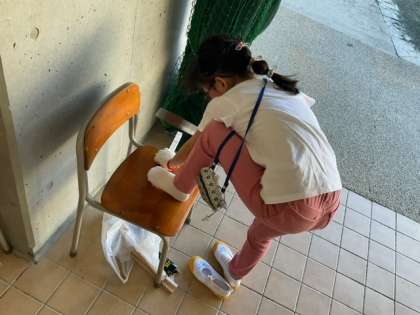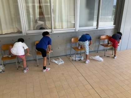図工の時間です。ノコギリに挑戦しています。どの子も真剣そのものです。