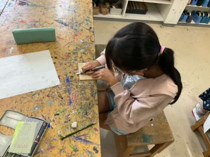 図工の時間です。「彫りすすみ版画」板4枚を組み合わせて、オリジナルの図柄を考え、彫り進めていきます。
